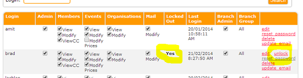In the list of users, under Locked Out, Yes will appear for the locked out user. An unlock link will appear toward the end of the row. Click it to instantly unlock the account.