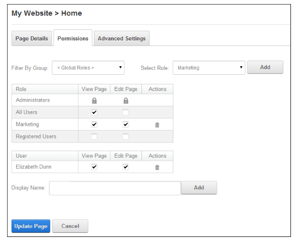 - Select ‘Page Permissions’ from the ‘Edit ‘ Page menu of the ControlBar. This displays the ‘Permissions’ tab that shows the current page permissions for Administrators, All Users, Registered Users and any other role user who has been granted permission to this page.